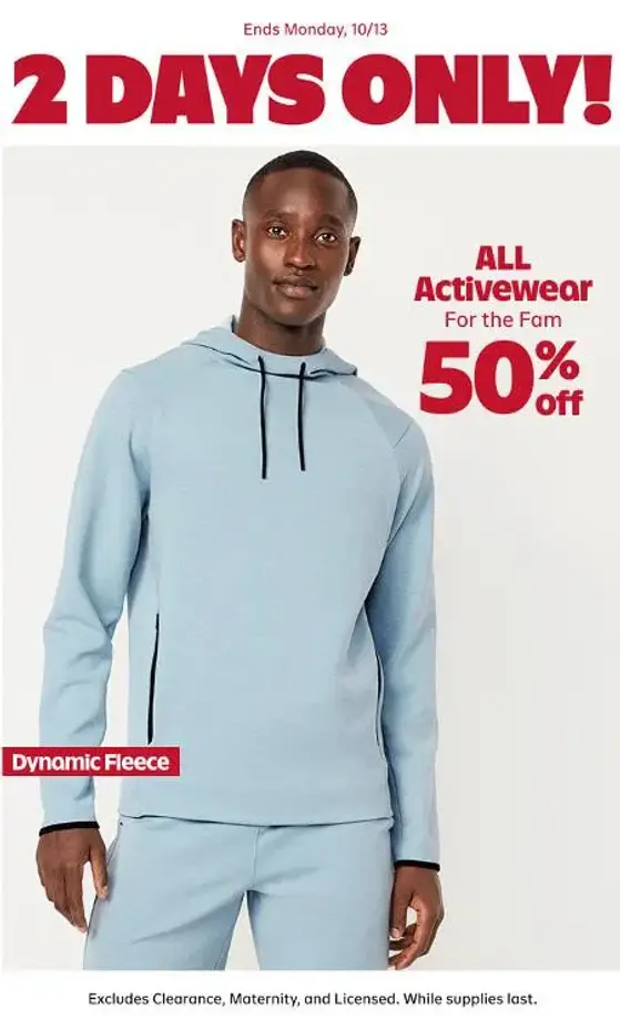 Offer valid 10/12/25 - 10/13/25 at Old Navy stores in the United States (including Puerto Rico) and at Old Navy online. Excludes Clearance, Licensed, Items sold and shipped by third parties, Maternity, Toddler & Baby 0-24 months. While supplies last. No adjustments on previous purchases. Cannot be combined with other offers or discounts, including Gap Inc. employee discount.